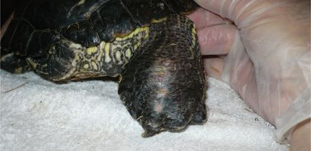 ■熱調整装置又は日光浴設備からくる不適切な環境温度が原因の接触性火傷(特に背びれ部分)。