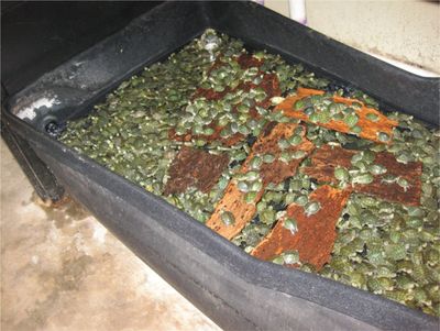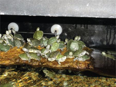 写真8は海ガメの幼亀が土のあるスペースを確保できず、甲羅干し用の熱設備を使用することができない状態の過密住居例である。
